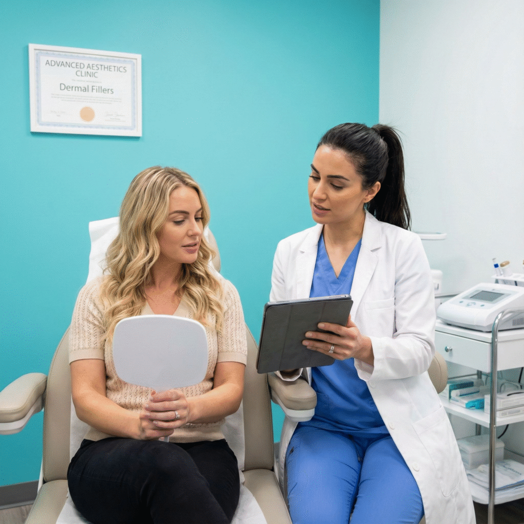 Dermal fillers are injectable substances used to restore volume, smooth wrinkles, and enhance facial contours. They’re commonly used in cosmetic procedures to address signs of aging or to achieve specific aesthetic goals. The fillers are often made from substances like hyaluronic acid, calcium hydroxylapatite, or poly-L-lactic acid, and they work by adding volume to areas of the face. It’s important to consult a medical professional before undergoing any cosmetic procedure involving dermal fillers.