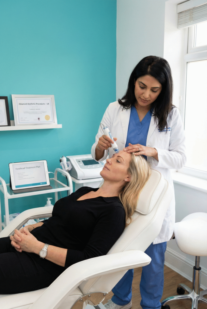 Forehead treatment is a non-surgical cosmetic procedure designed to reduce horizontal lines and wrinkles that develop due to aging, sun exposure, and repeated facial expressions. These lines can make the face appear tired or aged, even at rest. Treating the forehead helps create a smoother, more relaxed, and youthful appearance.