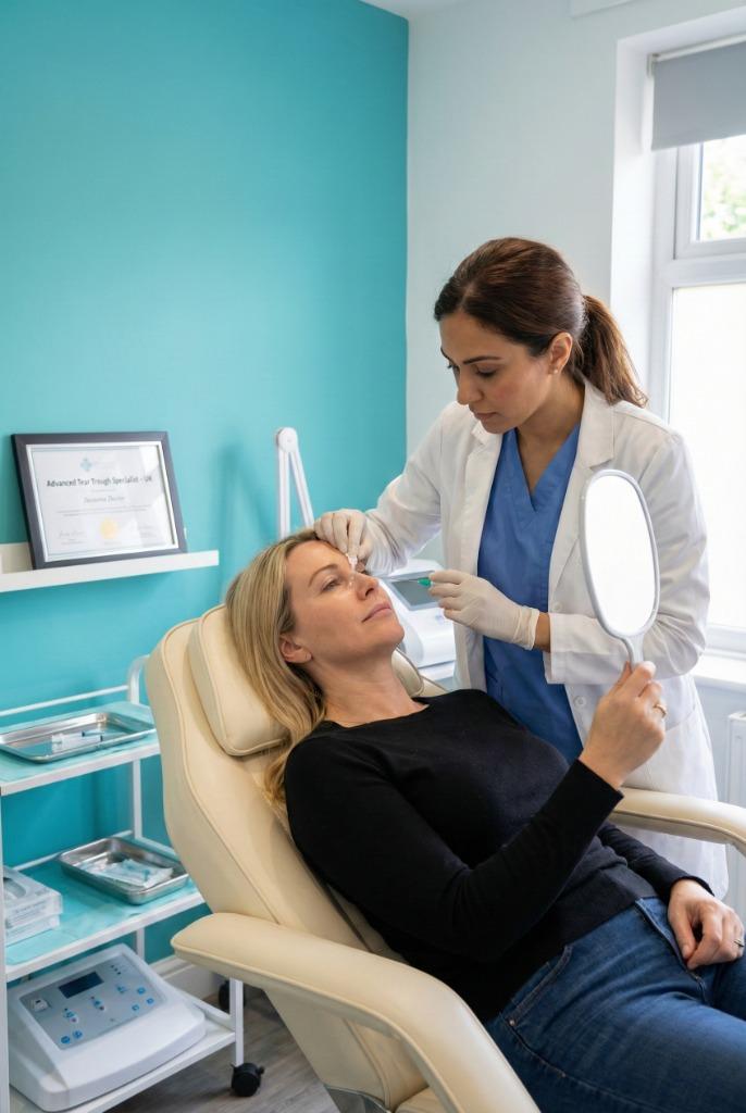 Tear trough treatment is a non-surgical cosmetic procedure designed to improve hollowing, dark circles, and tired-looking eyes. The tear trough area, located between the lower eyelid and upper cheek, can become sunken with age due to volume loss, thinning skin, and reduced collagen. This often creates shadows that make the face appear fatigued or older.